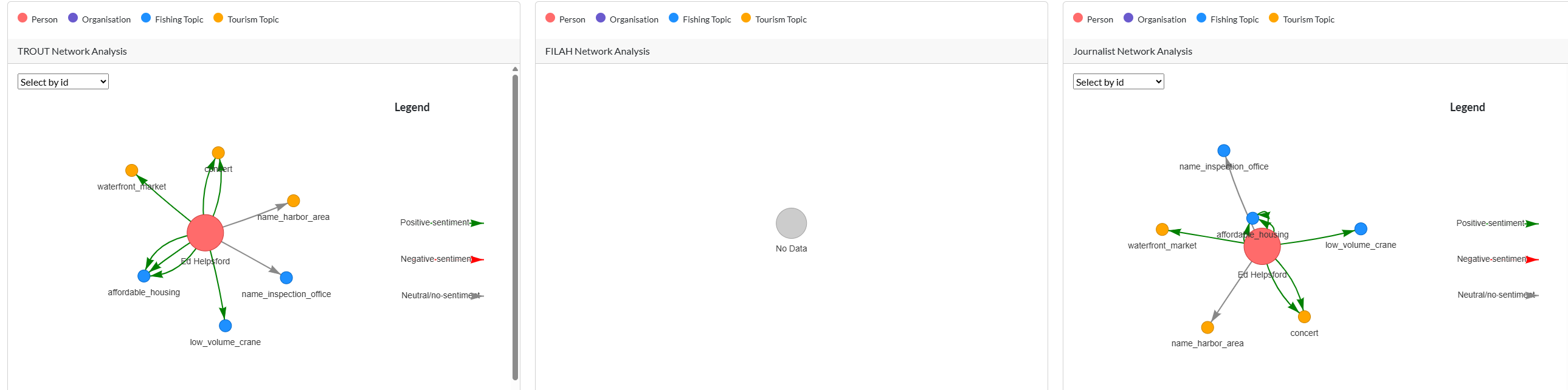 The network panels reinforce the gap: TROUT and Journalist show Ed at the hub of green arrows to topics such as affordable_housing, low_volume_crane and concert, whereas the FILAH pane collapses to No Data.