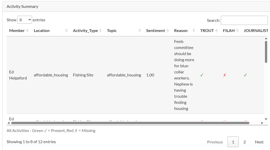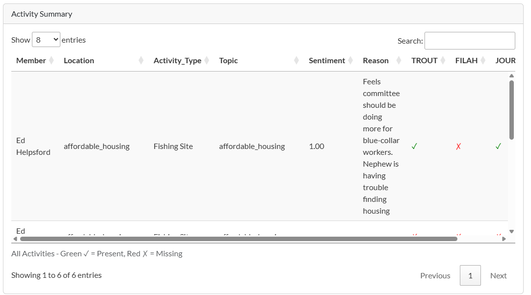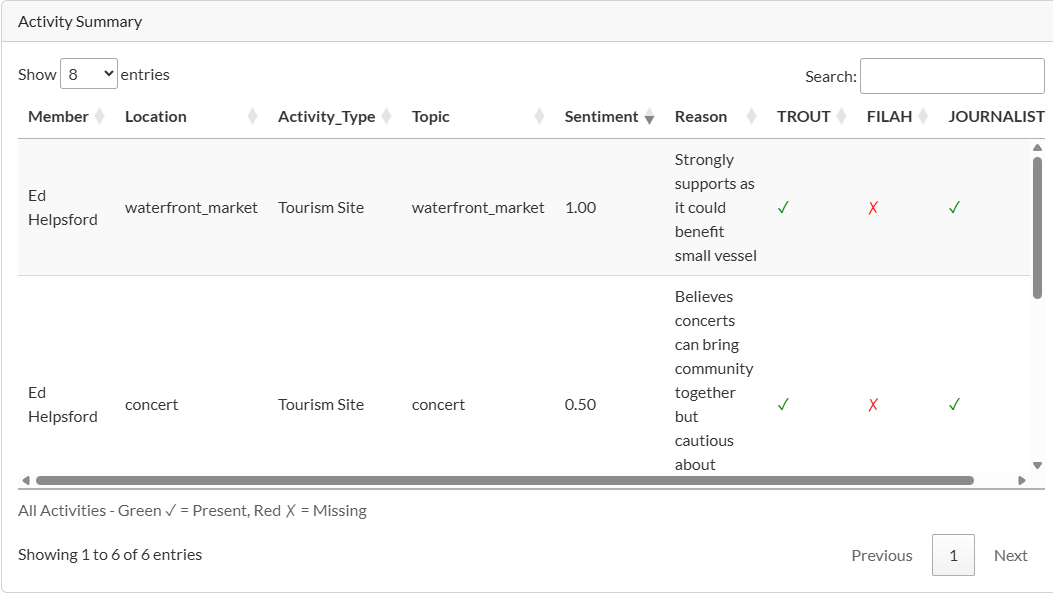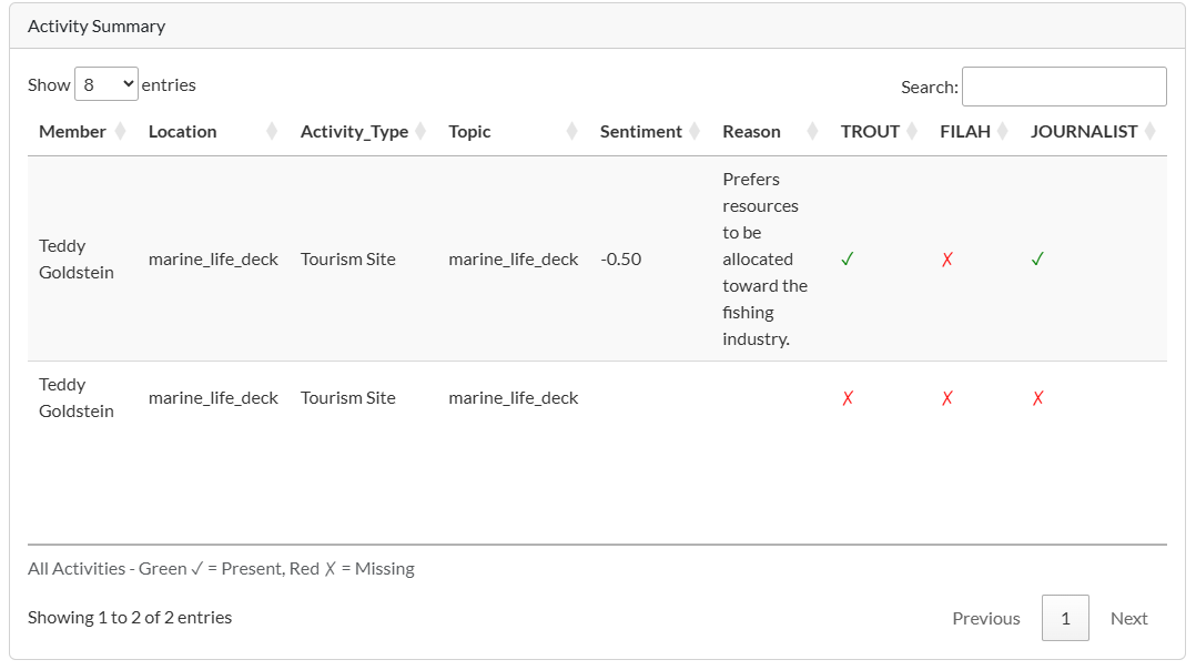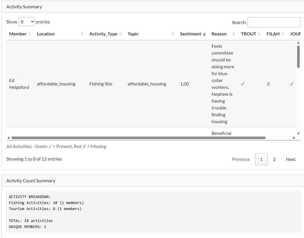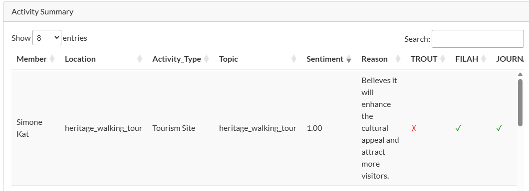 Scrolling the Activity-summary, every line for Simone shows red âś— under TROUT while FILAH and JOURNALIST supply multiple positive tourism items such as: