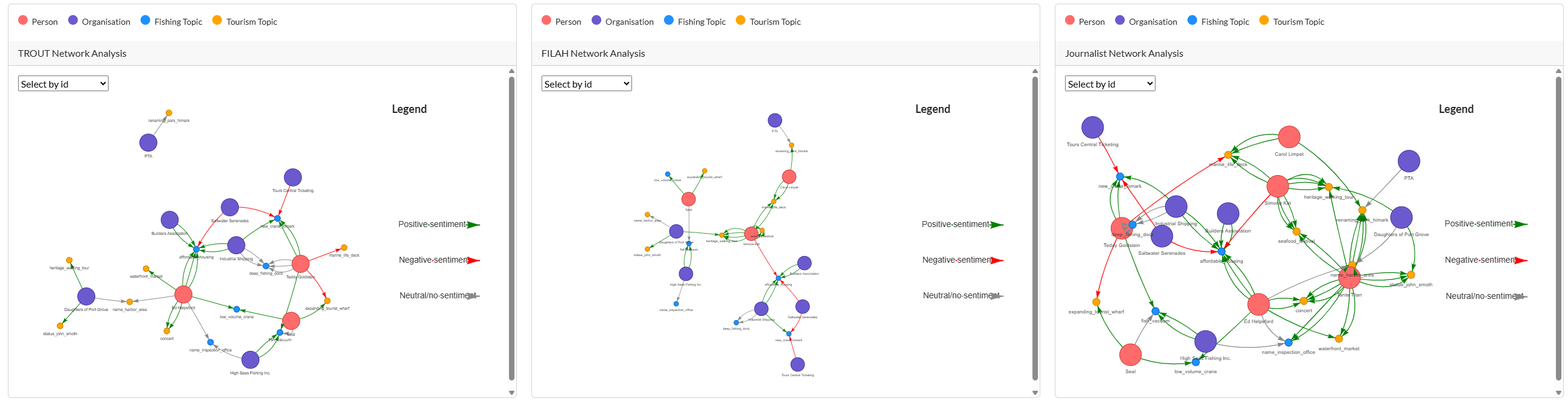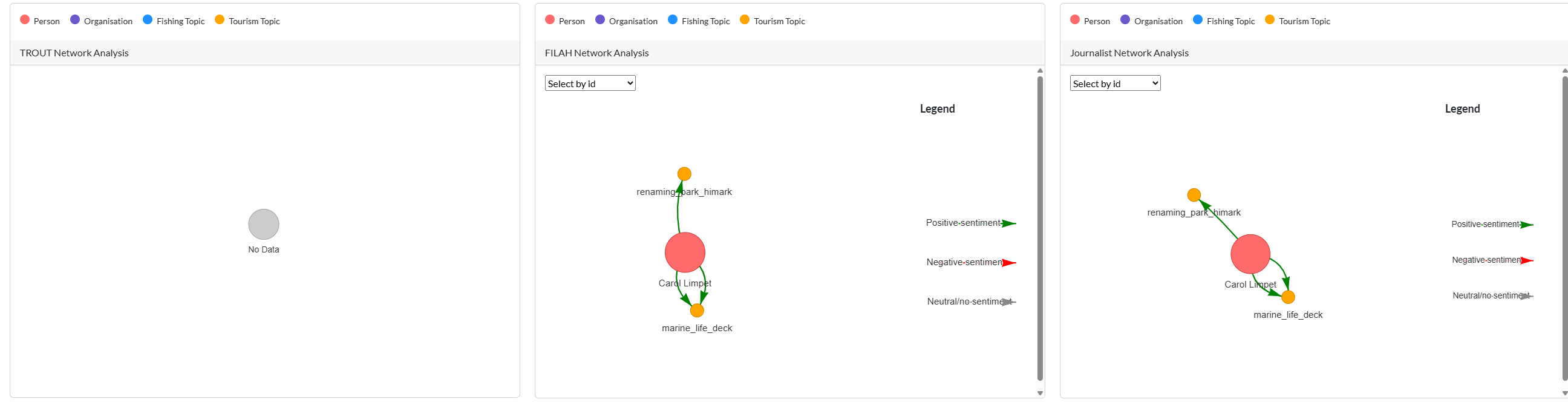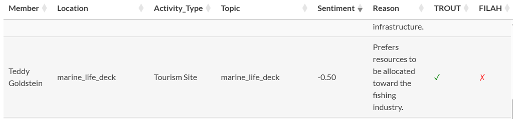 The sentiment heat-map shows that TROUT and the Journalist dataset both portray Teddy Goldstein as negative towards tourism, yet neutral-to-positive towards fishing. Zooming into the TROUT network view reveals a negative edges target marine_life_deck, a tourism topic. The Activity Summary confirms the justification, prefers resources to be allocated toward the fishing industry. On the map, marine_life_deck, is situated around the blue region which is for fishing activity. The fuller context therefore suggests that Goldstein’s objection is location-specific rather than anti-tourism in principle, he resists placing a tourism facility in a predominant fishing zone.