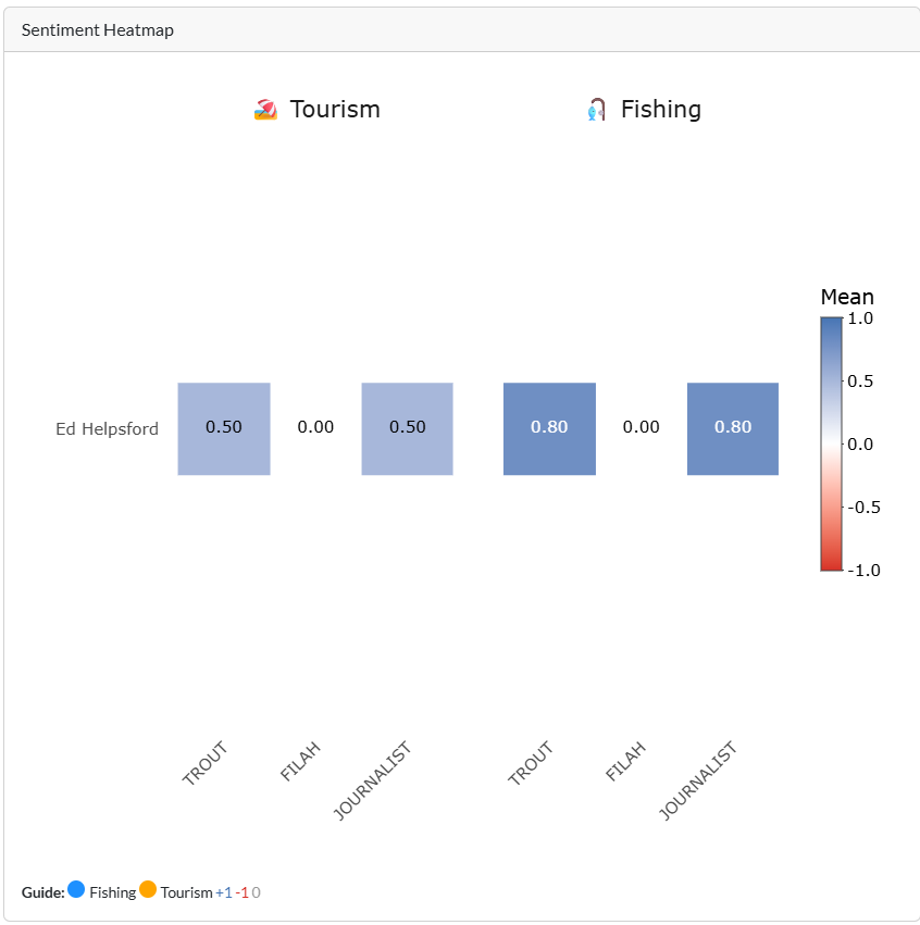 With all three datasets ticked the sentiment heat-map reports Ed Helpsford as strongly positive toward both Fishing (+0·80) and Tourism (+0·50) in TROUT and the Journalist records, yet entirely blank in the FILAH column.
