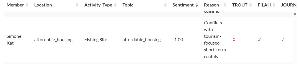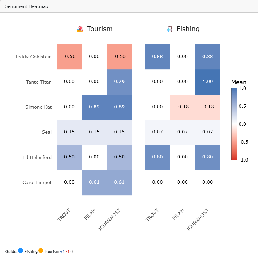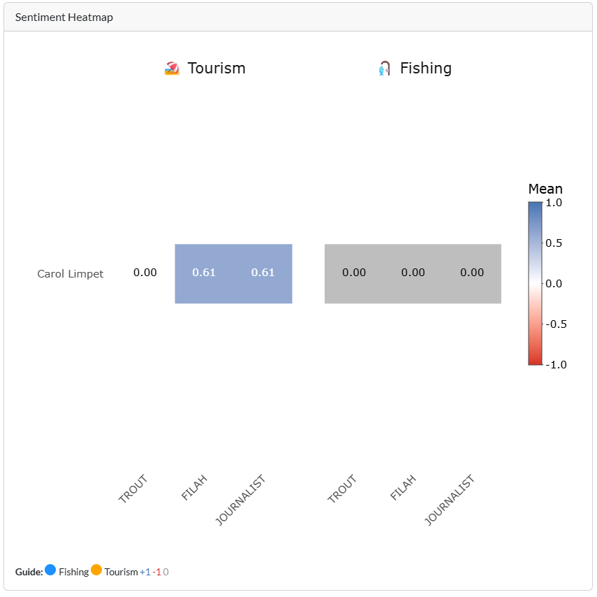 The FILAH and Journalist columns reveal a solid +0.61 Tourism sentiment, while TROUT stays at 0.00, giving the false impression that Carol is neutral.