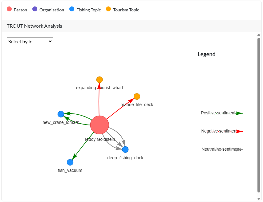 Zooming into the TROUT network reveals negative sentiment links from Goldstein to marine_life_deck and expanding_tourist_wharf reinforcing the impression that he opposes tourism.