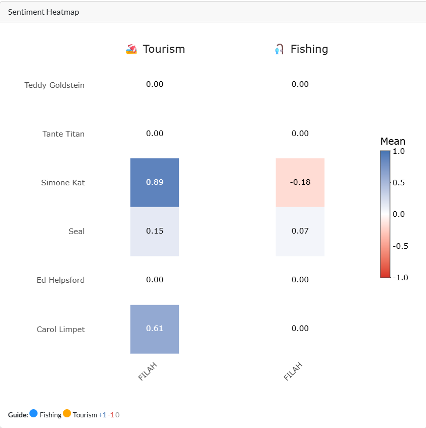 The contrast between blank and blue cells shows that FILAH suppressed the most active voices while recording moderate Tourism sentiment for a subset of members.