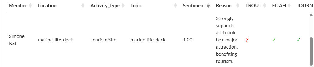 Once the FILAH and Journalist sources are added, three tourism-related messages appear, each positive, and one mildly negative fishing remark is revealed. These extra rows lift her Tourism mean to +0.89 and push her Fishing mean down to -0.18, flipping the overall judgement from “indifferent” to “tourism advocate who questions certain fishing practices”.