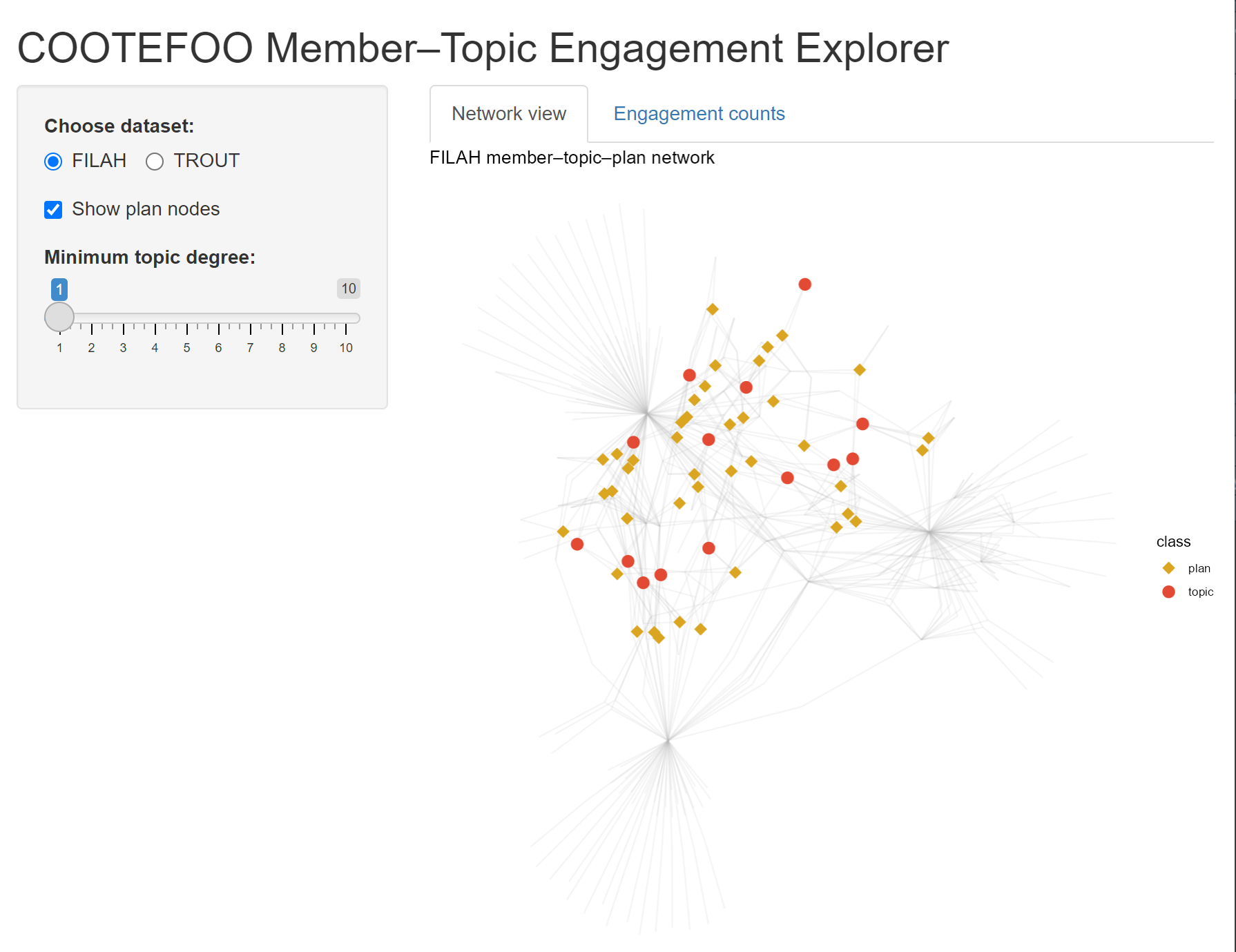 Network Analysis of Members, Topics, and Plans: Offers a detailed view of relationships and engagement across topics, pinpointing central figures and patterns of interactions.