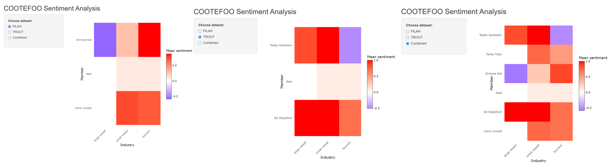 Three interactive sentiment heatmaps (plotly) explicitly compare average sentiment (negative to positive) for each member across FILAH, TROUT, and the comprehensive combined dataset.