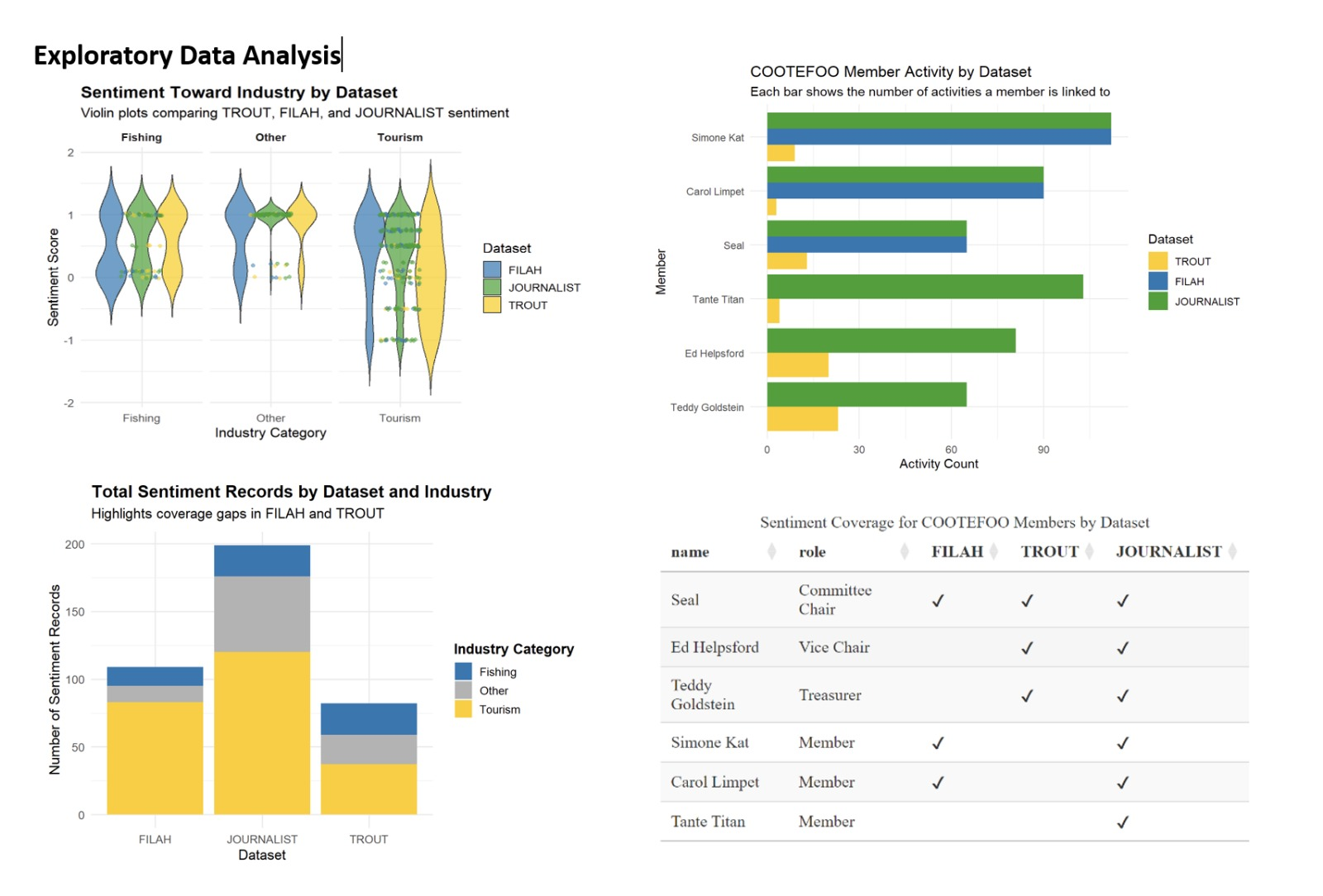 With clear insights into engagement and travel, Moray now examines the underlying emotional tone of COOTEFOO members’ recorded comments across the fishing and tourism contexts. Critically, Moray needs to understand how missing records from FILAH and TROUT distort or shift perceptions when compared with the combined complete dataset.