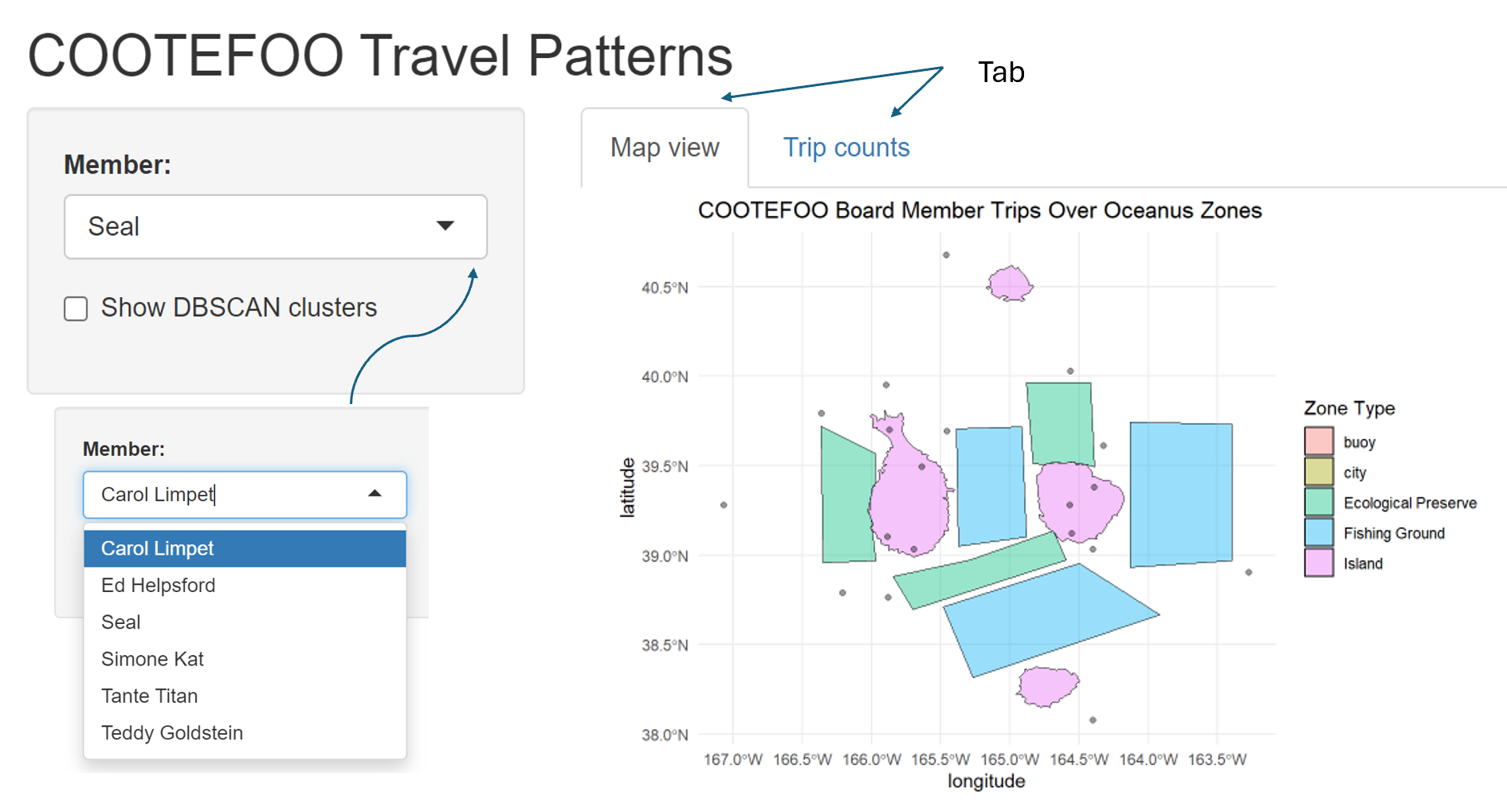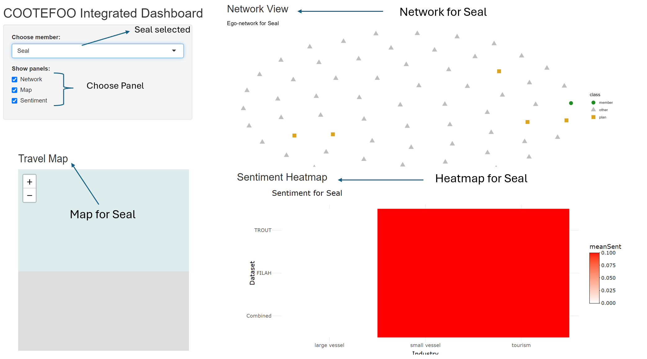 Moray selects any COOTEFOO member (defaulting explicitly to one TROUT-accused member, e.g., Seal) to synchronously update visualisations: