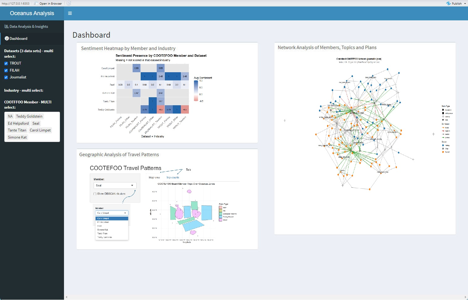 A force-directed node-link diagram (ggraph) explicitly illustrates relationships among COOTEFOO members, discussion topics (fishing/tourism), and plans. Nodes and edges coloured by industry reveal patterns of engagement.