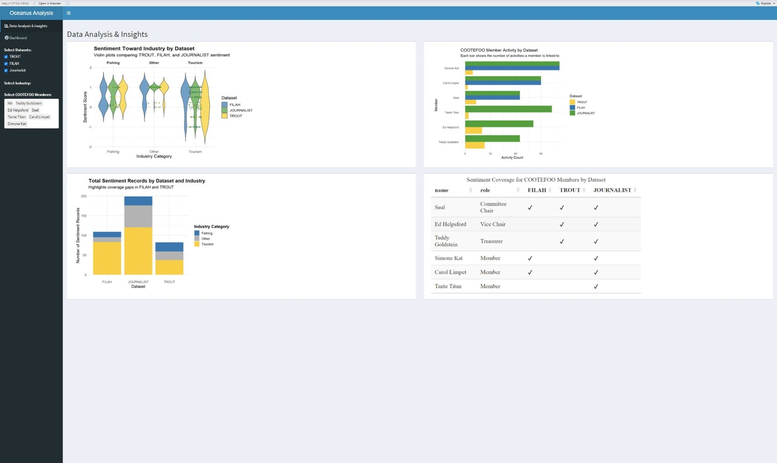 This dashboard provides preliminary insights into the datasets provided by FILAH, TROUT, and JOURNALIST. The user starts by selecting datasets, industries, or specific COOTEFOO members. Four visualisations summarise: